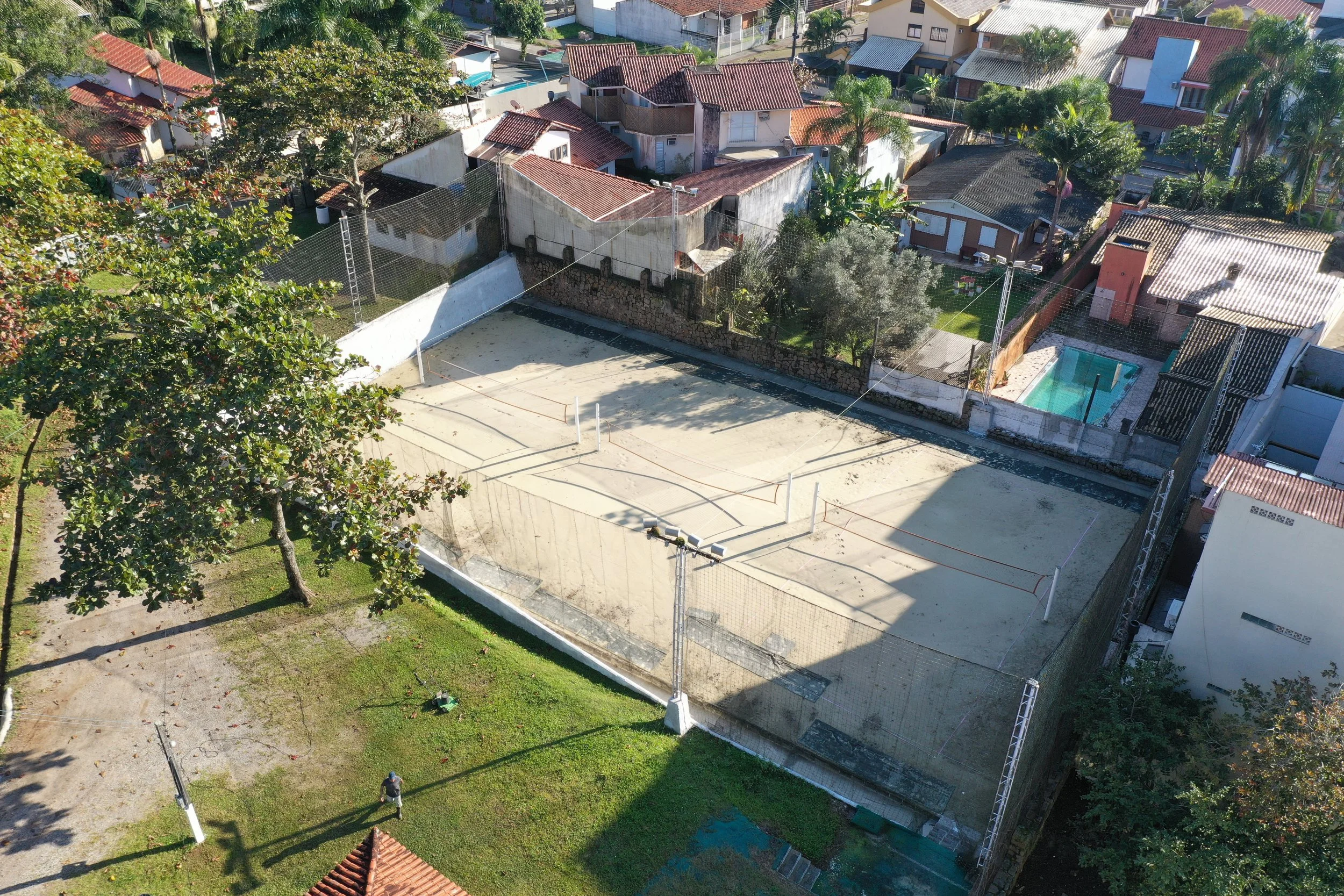 Área social com cozinha completa, bar, geladeiras, churrasqueira, espaço para armazenamento, banheiros, quadras de areia para beach tennis ou vôlei de praia, e muito espaço ao ar livre.